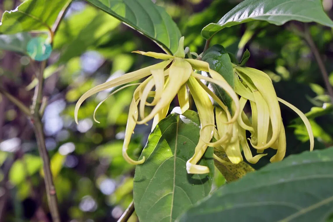 Plants at the Woodlands garden include the ylang ylang (Cananga odorata), a tropical tree with bright yellow flowers that produces a floral and fruity scent.