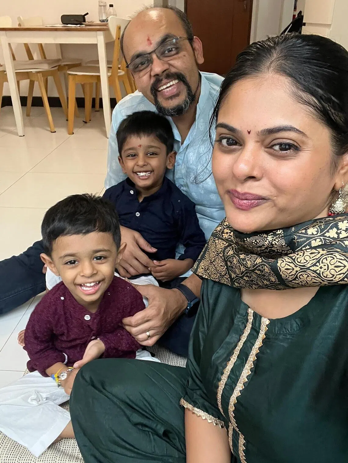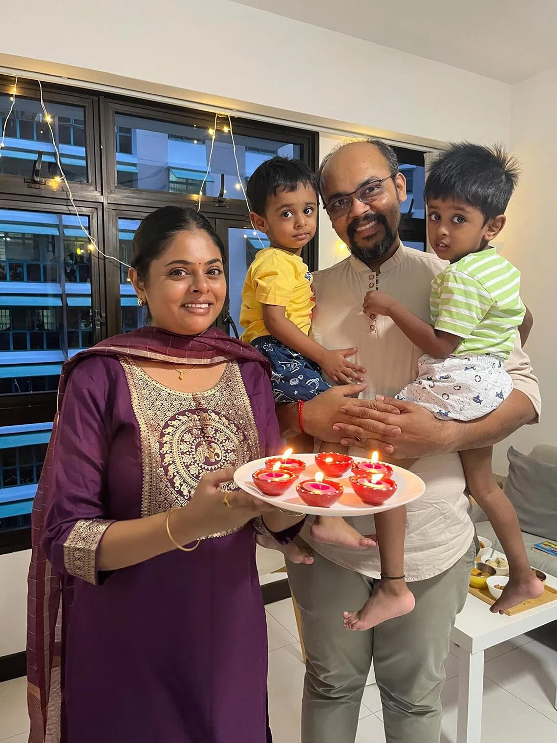 Mrs Kinnari Bhosale, a housewife, her husband Satyajit Bhosale and their twin sons, Anant and Anvay, during Deepavali.