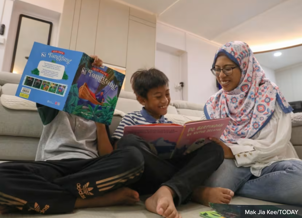 Secondary school Malay language teacher Nur Asyikin Naser reading storybooks in Malay with her children. — TODAY pic