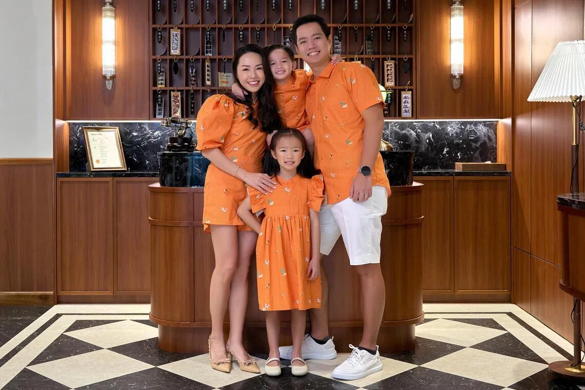 Actress-model Sheila Sim and her family in matching outfits from the Lotus series.