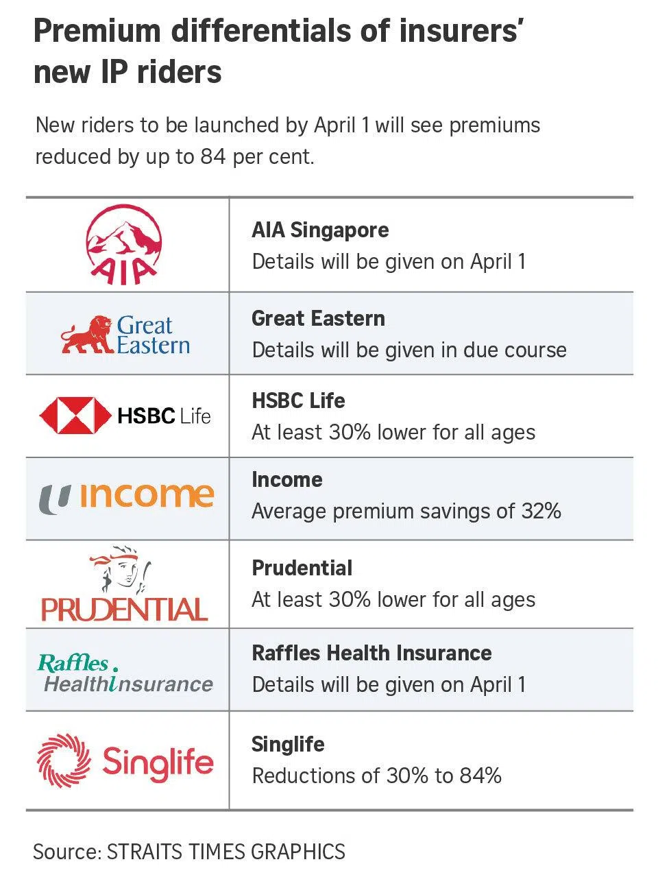 SINGAPORE – Private health insurers gearing up for the launch of new riders have revealed that policyholders who switch schemes come April 1 could see premium reductions of at least 30 per cent, with one insurer offering premium reductions of up to 84 per cent.