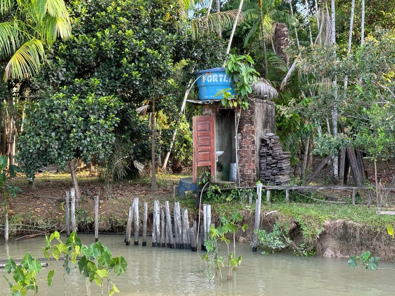 The yoga teacher pointed to a toilet at the edge of the river bank, saying that it was the last remnant of her old family home. The family is building a newer structure further inland.