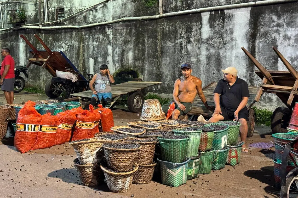 Baskets of acai berries being sold on Nov 14 at the Acai port in the Juranhas neighbourhood in Belem.