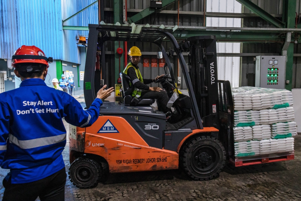 An employee operates a forklift to move sacks of sugar inside a warehouse at MSM Sugar Refinery in Pasir Gudang. — Picture by Firdaus Latif